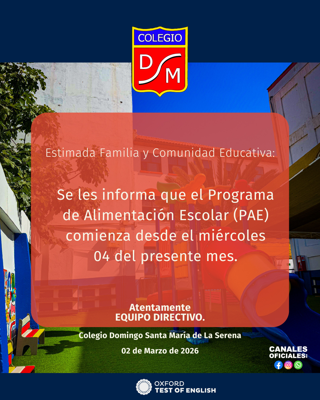 Inscríbete Ahora! Admision 2026 Haz clic aquí! ANUNCIOS IMPORTANTES Anuncios importantes 2 Mar 2026 Información Importante Anuncios importantes 24 Feb 2026 Información Importante Anuncios importantes 23 Feb 2026 Inicio de Clases 2026 Anuncios importantes 31 Dic 2025 Feliz Año 2026 Anuncios importantes 24 Dic 2025 Saludo de Navidad Anuncios importantes 17 Dic 2025 Con Profundo Pesar Anuncios importantes 2 Mar 2026 Información Importante Anuncios importantes 24 Feb 2026 Información Importante Anuncios importantes 23 Feb 2026 Inicio de Clases 2026 Anuncios importantes 31 Dic 2025 Feliz Año 2026 Anuncios importantes 24 Dic 2025 Saludo de Navidad Anuncios importantes 17 Dic 2025 Con Profundo Pesar ACCESOS DIRECTOS Notas Net apoderados NOTAS NET TEL CORREOS ALUMNOS LISTA DE ÚTILES HORARIO CLASES REGLAMENTO EFEMÉRIDES Efemérides 10 Sep 2025 Día mundial para la prevención del suicidio Efemérides 8 Sep 2025 Día internacional de la Alfabetización y de la Educación de personas jóvenes y adultas Efemérides 5 Sep 2025 Día de la Mujer Indígena Efemérides 4 Sep 2025 Día Mundial de la Salud Sexual Efemérides 31 Ago 2025 Día Nacional de las Personas Sordas Efemérides 28 Ago 2025 Día del Técnico en Educación Parvularia