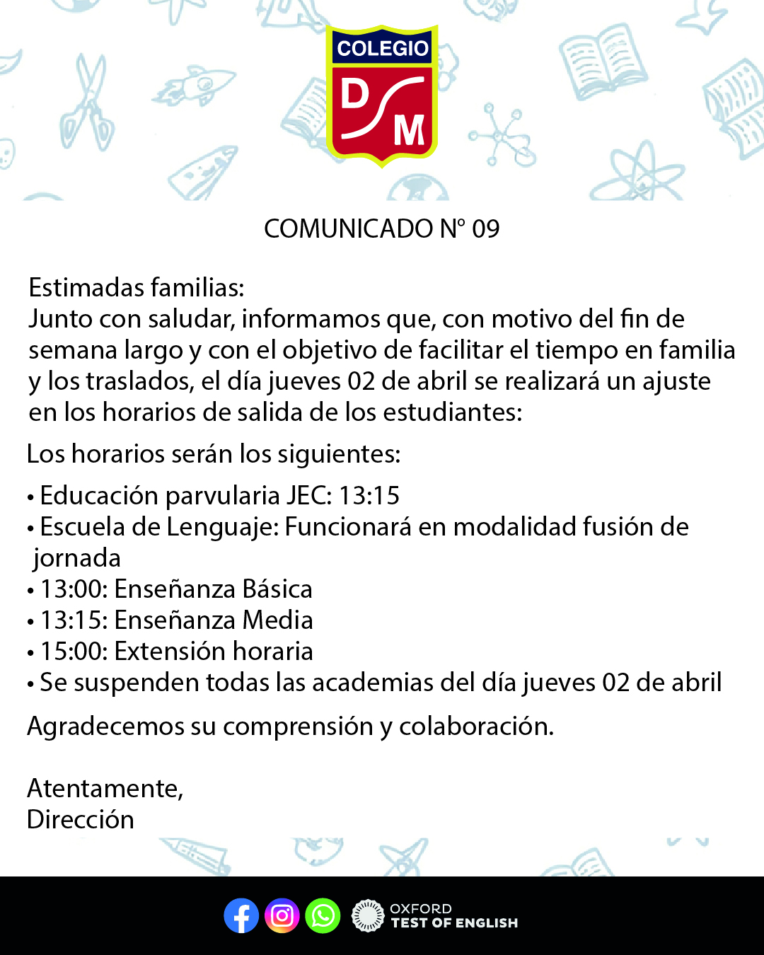 Inscríbete Ahora! Admision 2026 Haz clic aquí! ANUNCIOS IMPORTANTES Anuncios importantes 1 Abr 2026 Comunicado Importante Anuncios importantes 30 Mar 2026 DÍA DE LA FAMILIA Y DE LA ACTIVIDAD FÍSICA Anuncios importantes 25 Mar 2026 Ruta de Egreso Anuncios importantes 23 Mar 2026 Una Noticia que nos llena de Orgullo Anuncios importantes 12 Mar 2026 Nuestro Colegio obtuvo Excelencia Académica. Anuncios importantes 12 Mar 2026 Programa Oxford Anuncios importantes 1 Abr 2026 Comunicado Importante Anuncios importantes 30 Mar 2026 DÍA DE LA FAMILIA Y DE LA ACTIVIDAD FÍSICA Anuncios importantes 25 Mar 2026 Ruta de Egreso Anuncios importantes 23 Mar 2026 Una Noticia que nos llena de Orgullo Anuncios importantes 12 Mar 2026 Nuestro Colegio obtuvo Excelencia Académica. Anuncios importantes 12 Mar 2026 Programa Oxford ACCESOS DIRECTOS Notas Net apoderados NOTAS NET TEL CORREOS ALUMNOS LISTA DE ÚTILES HORARIO CLASES REGLAMENTO EFEMÉRIDES Efemérides 21 Mar 2026 Día de la Astronomía Efemérides 21 Mar 2026 Día Internacional de las personas con Síndrome de Down Efemérides 18 Mar 2026 Día de los Niños Indígenas Efemérides 10 Sep 2025 Día mundial para la prevención del suicidio Efemérides 8 Sep 2025 Día internacional de la Alfabetización y de la Educación de personas jóvenes y adultas Efemérides 5 Sep 2025 Día de la Mujer Indígena